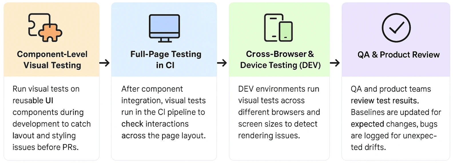 QA and product review: The QA and product teams examine test outcomes. When visual drift occurs because of intentional design modifications, the baseline receives an update. When visual drift occurs without purpose, the system logs a bug.